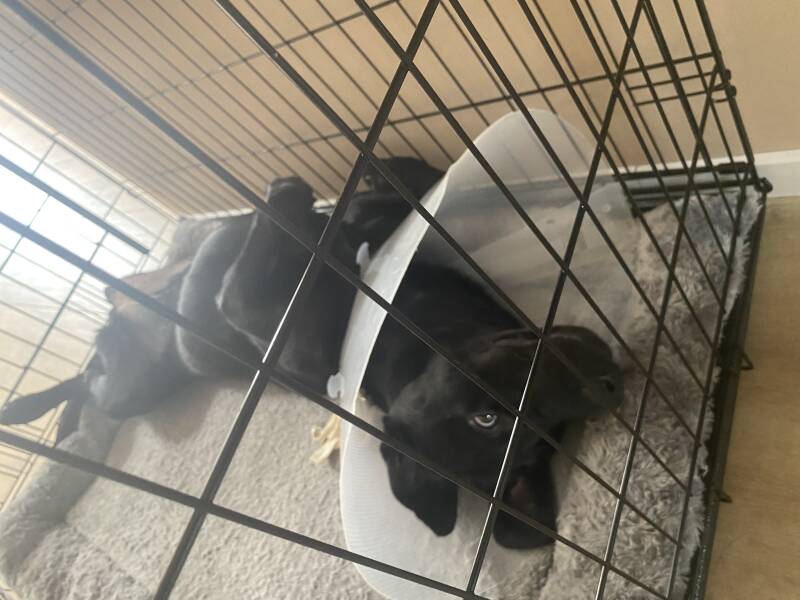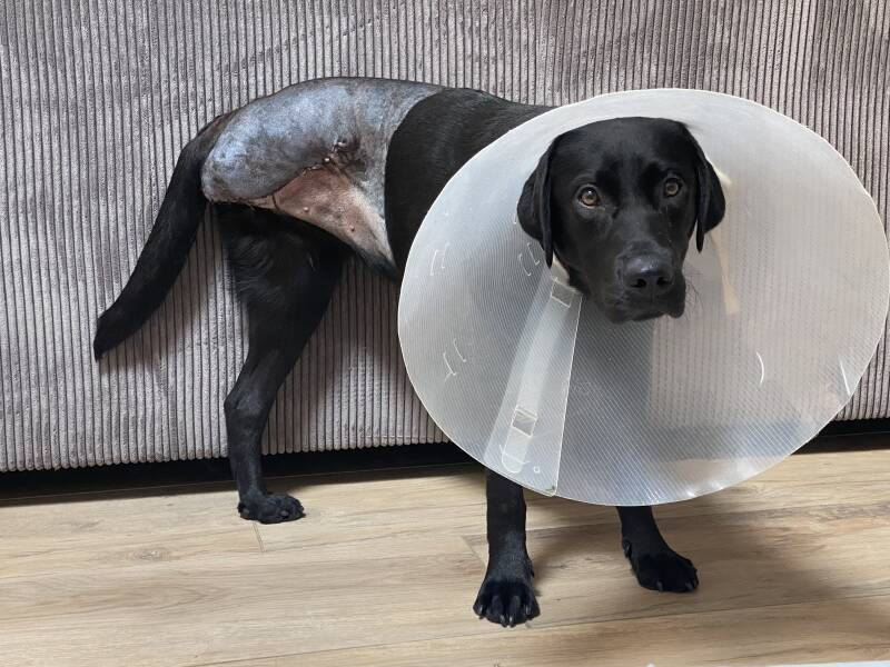 Op 4 augustus is Nora haar rechter achterpoot geamputeerd. De operatie is geslaagd en we mogen haar ophalen! Ze wordt naar ons toegedragen door de chirurg en de tranen rollen over mijn wangen. Vreselijk om je hondje zo te zien! Kaalgeschoren, een flinke wond… en zonder pootje.